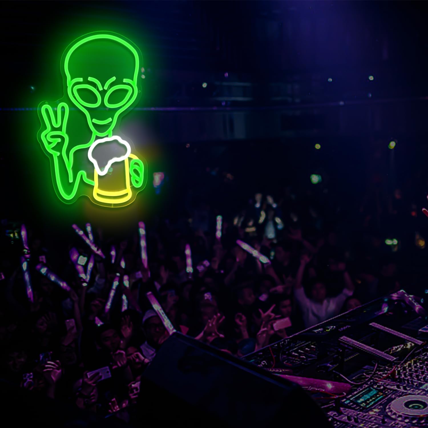 Alien Neon Sign with Drink & Peace Hand – LED Wall Light for Bars & Parties