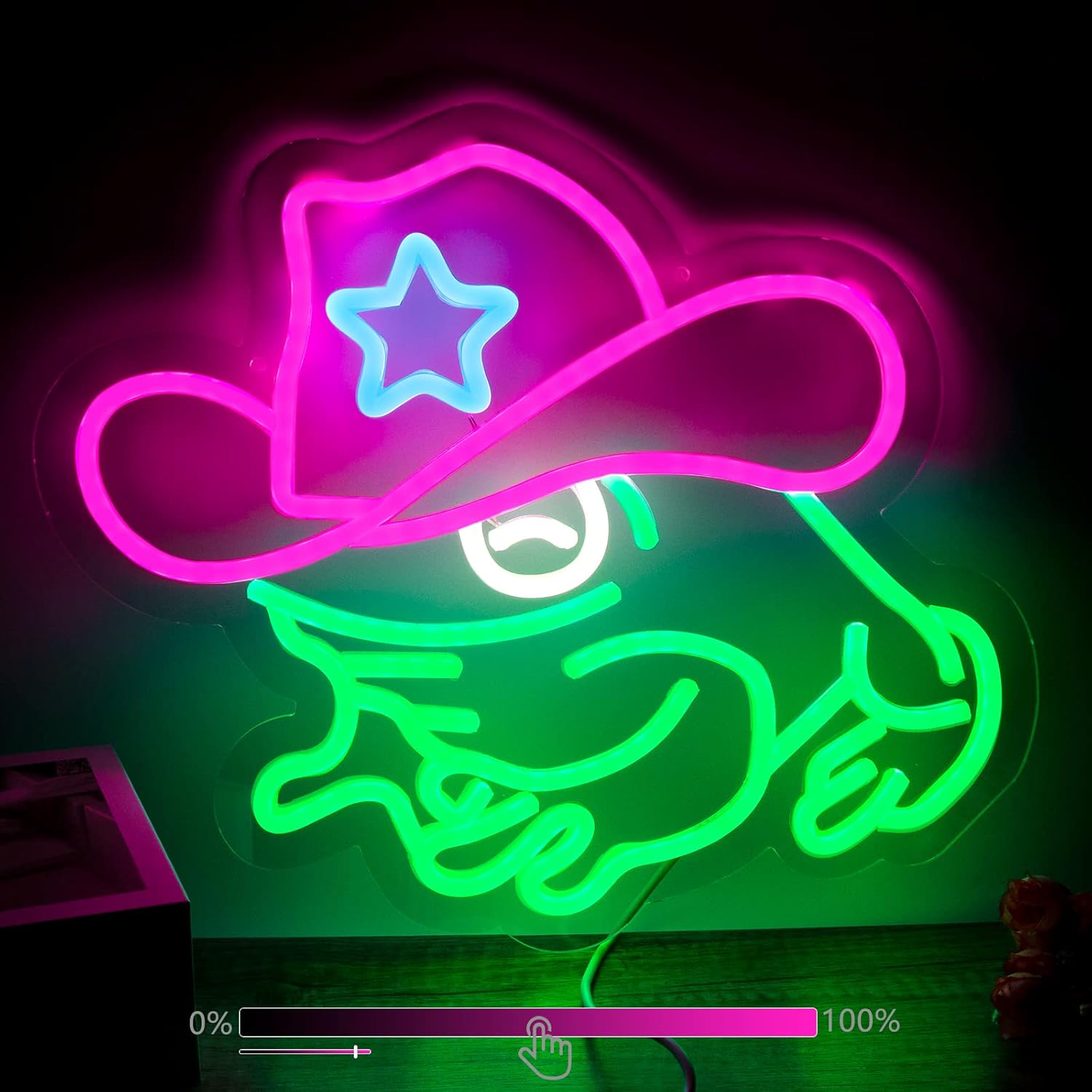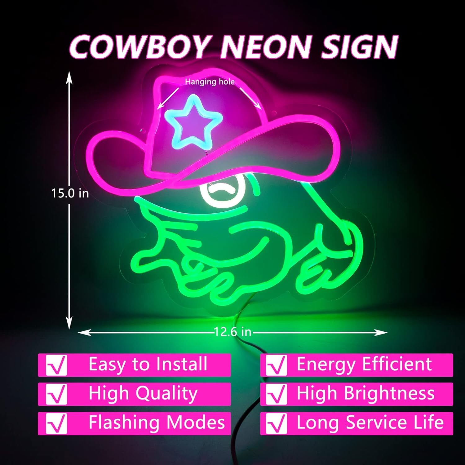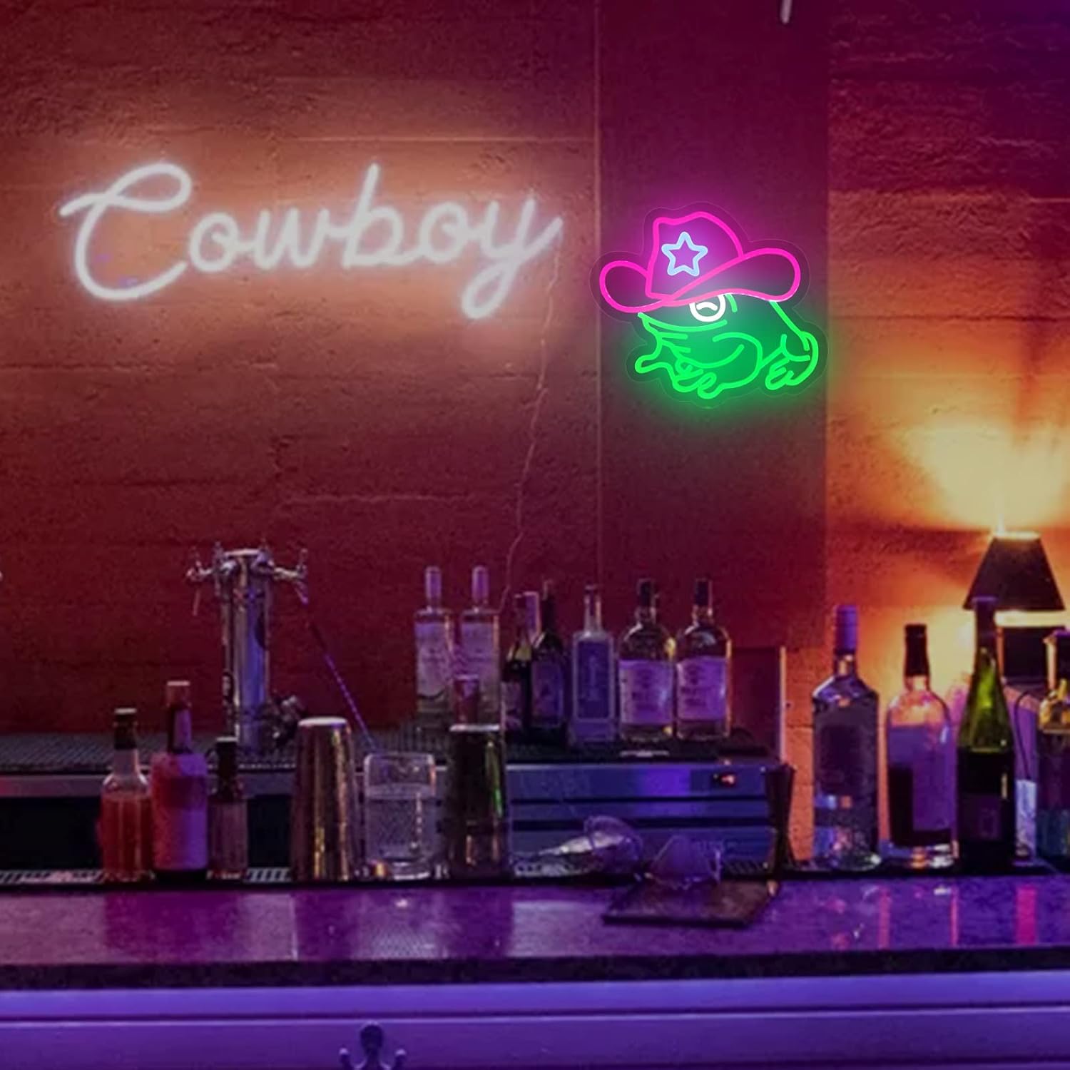 Cowboy Frog Neon Sign - Green LED Wall Light for Bars, Gamers & Western Decor
