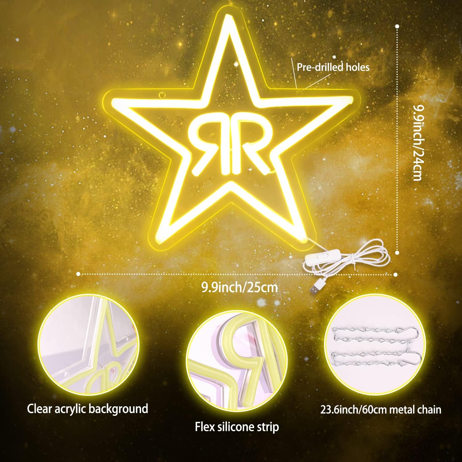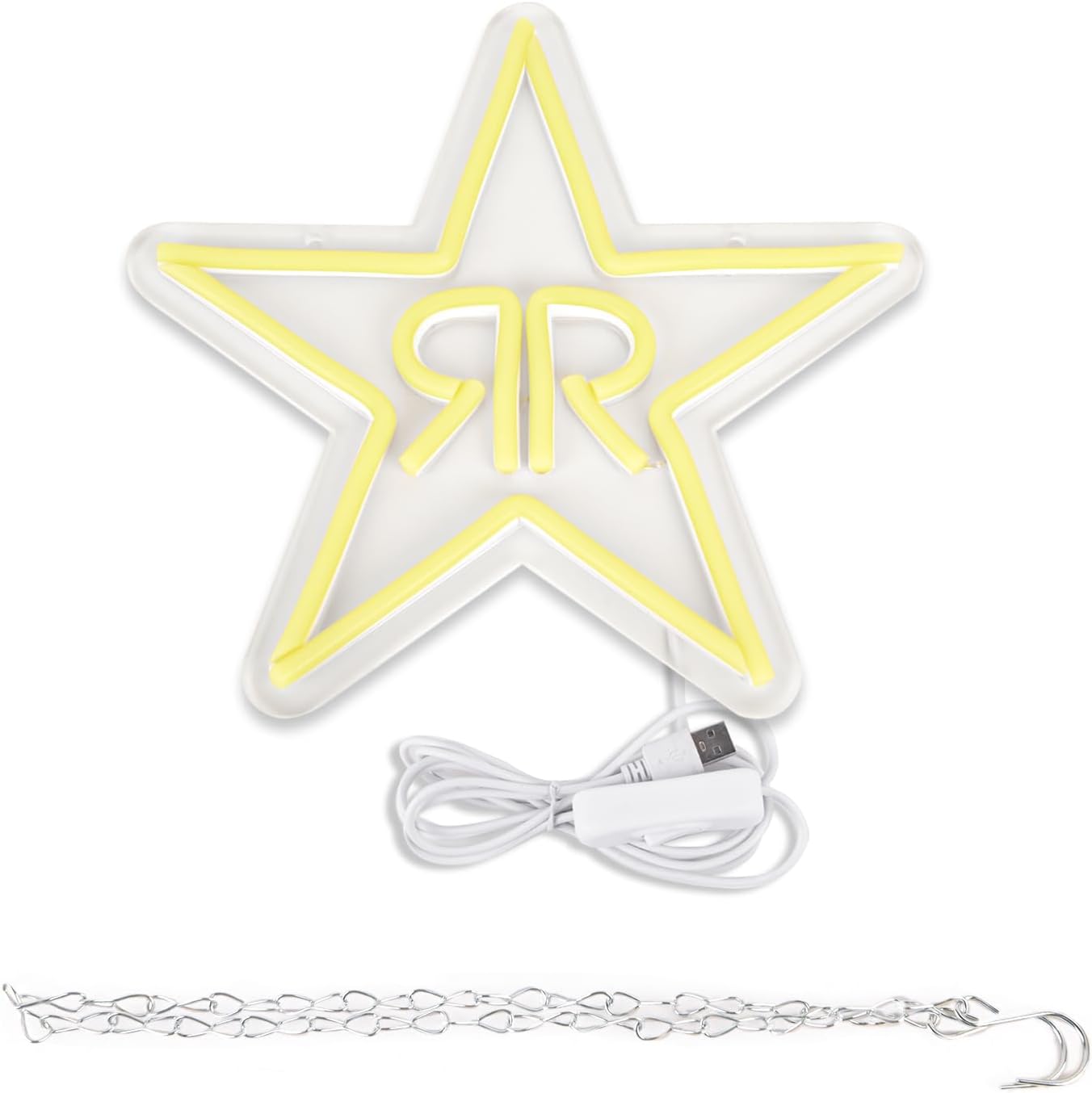 Illuminate your space with our Double R Star Neon Sign! Featuring a bold five-point star design with a stylish back-to-back 'R' pattern, this LED neon light is the perfect wall decor for bars, music studios, gaming rooms, and creative spaces. Crafted from energy-efficient LED tubing, it provides a vibrant glow while remaining cool to the touch. Whether you're enhancing your home decor or adding ambiance to a commercial setting, this neon sign is a statement piece.