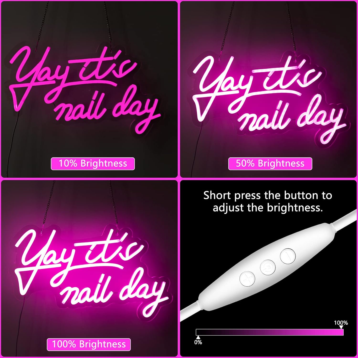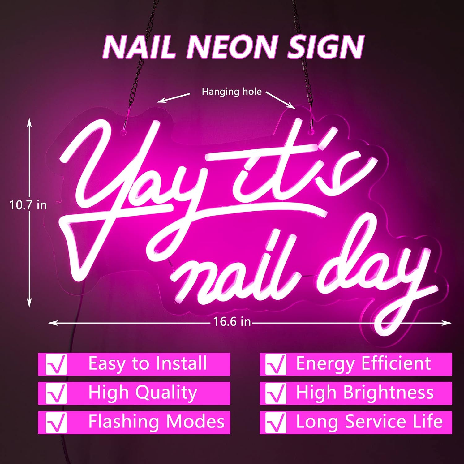 Transform your nail salon, beauty studio, or home manicure station with this vibrant YAY IT’S NAIL DAY LED neon sign. Designed to add a fun and stylish touch to your space, this glowing sign creates the perfect ambiance for self-care sessions, Instagram photos, and happy customers!